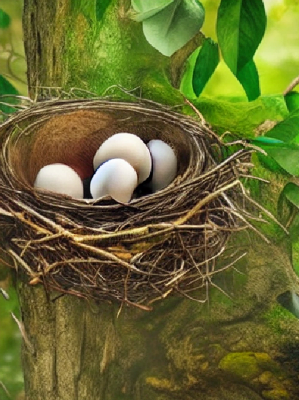 A bird's nest with eggs on a tree branch, A hidden waterfall in a tropical forest