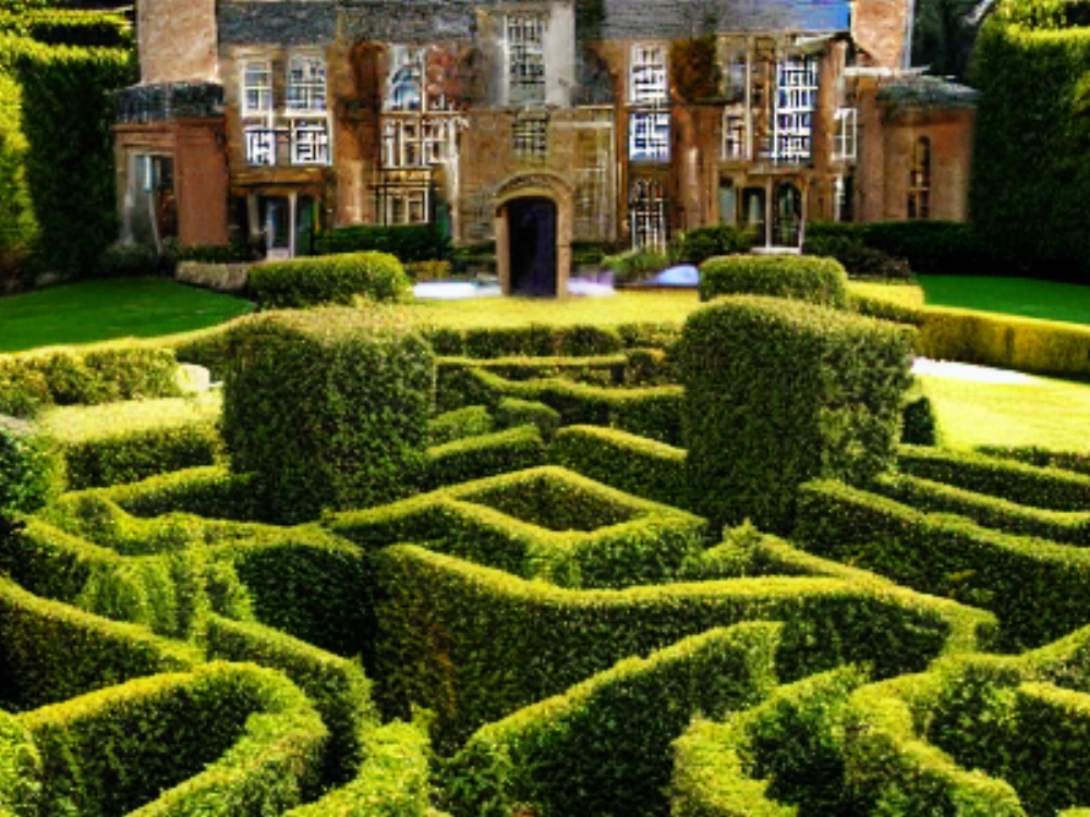 A large hedge maze in a stately home's garden, A pumpkin patch ready for harvest