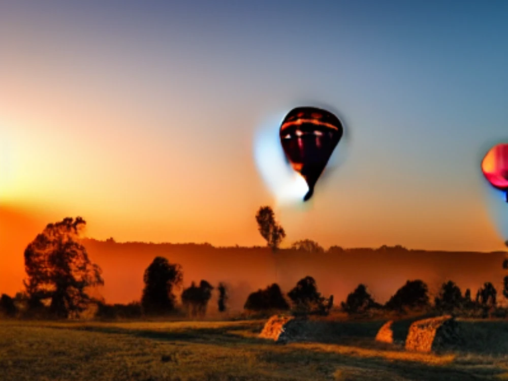 Hot air balloons floating over a landscape at sunrise, Ancient ruins reclaimed by nature