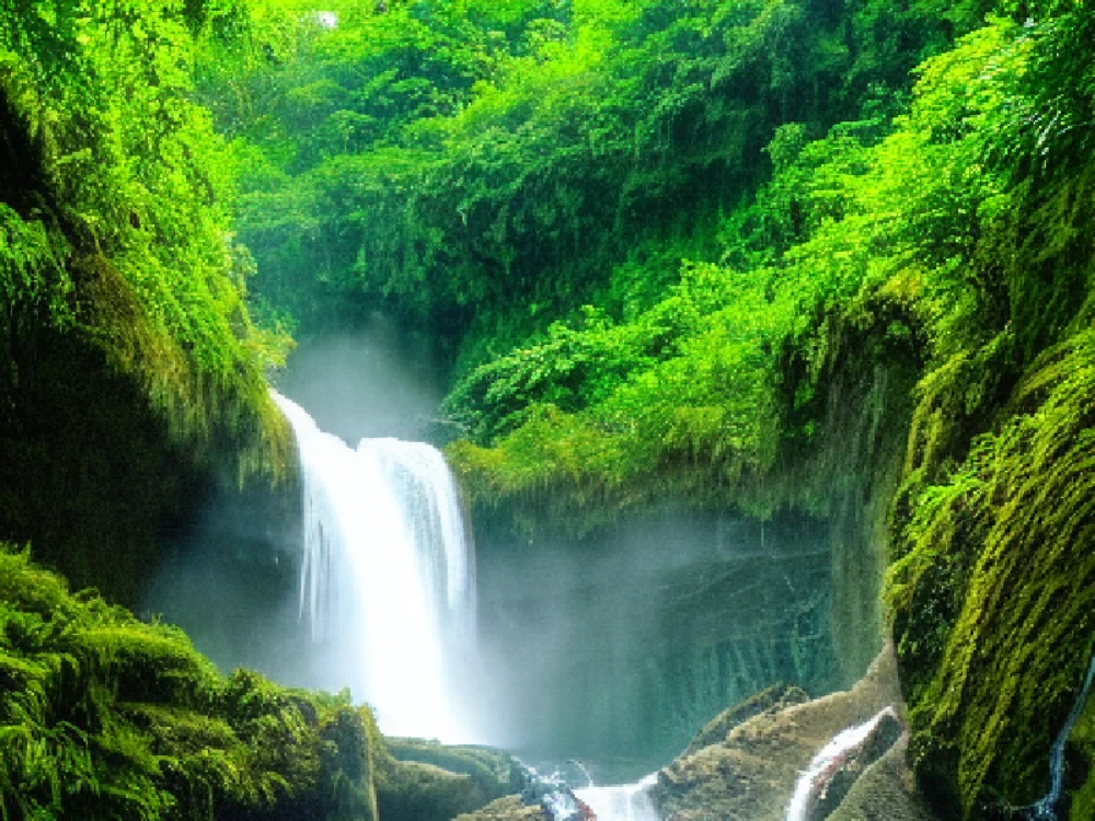 A majestic waterfall in a tropical rainforest, A tranquil forest with a winding river