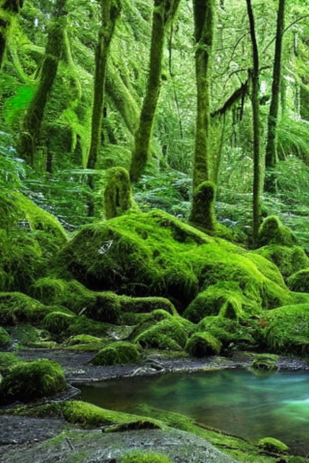In the heart of the forest, a serpentine river unwinds its gentle flow, its crystal waters reflecting the dappled canopy above, while soft moss and ferns carpet the ground, whispering ancient secrets to the rustling leaves that sway in harmony with the fo