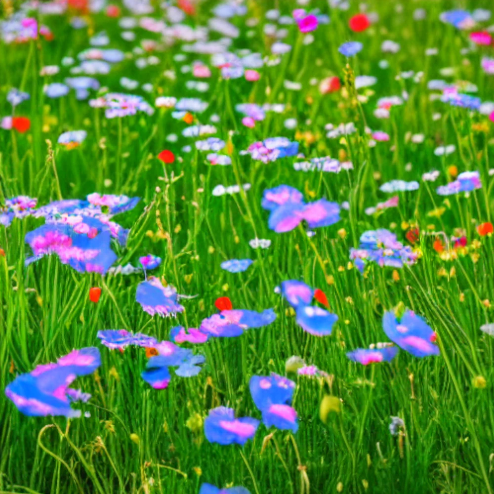 Vibrant petals dance across the lush green meadow, as if spring itself has burst into color. Delicate tendrils of forget-me-nots swirl amidst sun-kissed daisies and crimson poppies, their sweet fragrance wafting on the gentle breeze.