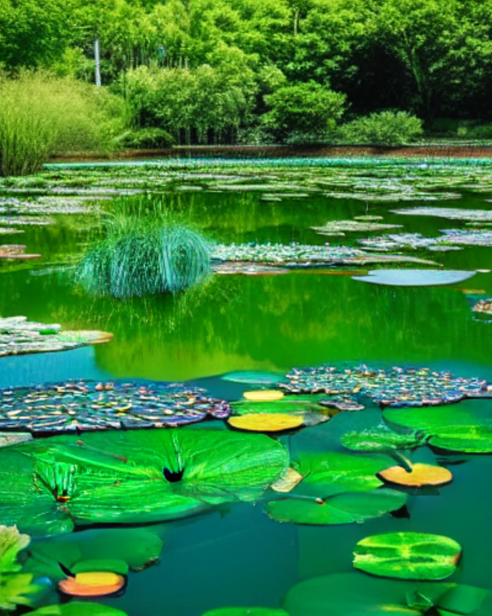 A serene pond glimmers in the sunlight, its tranquil surface adorned with emerald lily pads that stretch towards the sky like outstretched arms. Delicate lotus flowers burst into bloom, their petals unfolding like intricat