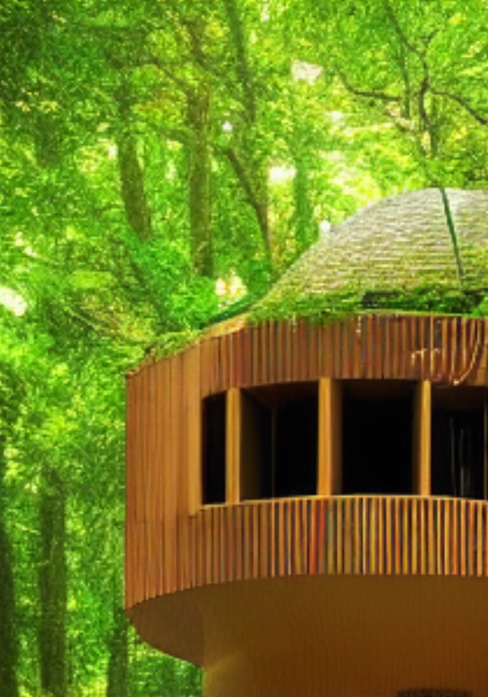 A space scene with distant galaxies and stars, A treehouse in a dense forest