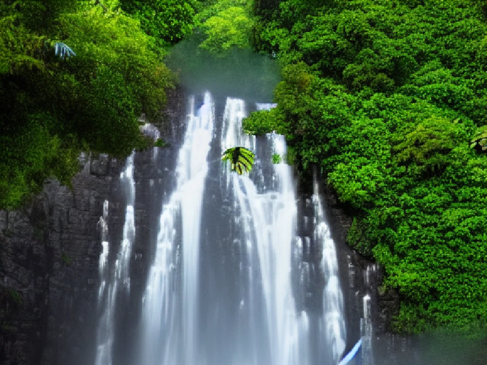 A majestic waterfall in a tropical rainforest, A bustling cityscape at night