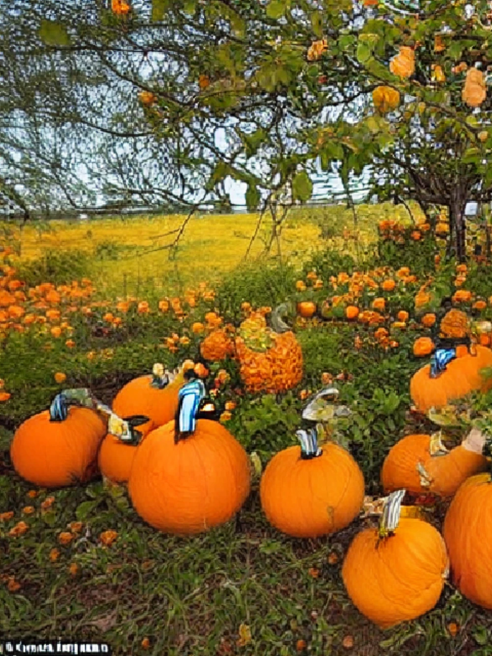 Ripened oranges and golden yellows burst forth from the vine-entwined earth, as if the sun itself had taken root. Plump, symmetrical pumpkins, some bearing whimsical scars, sprawled like a scattered treasure trove, awaitin