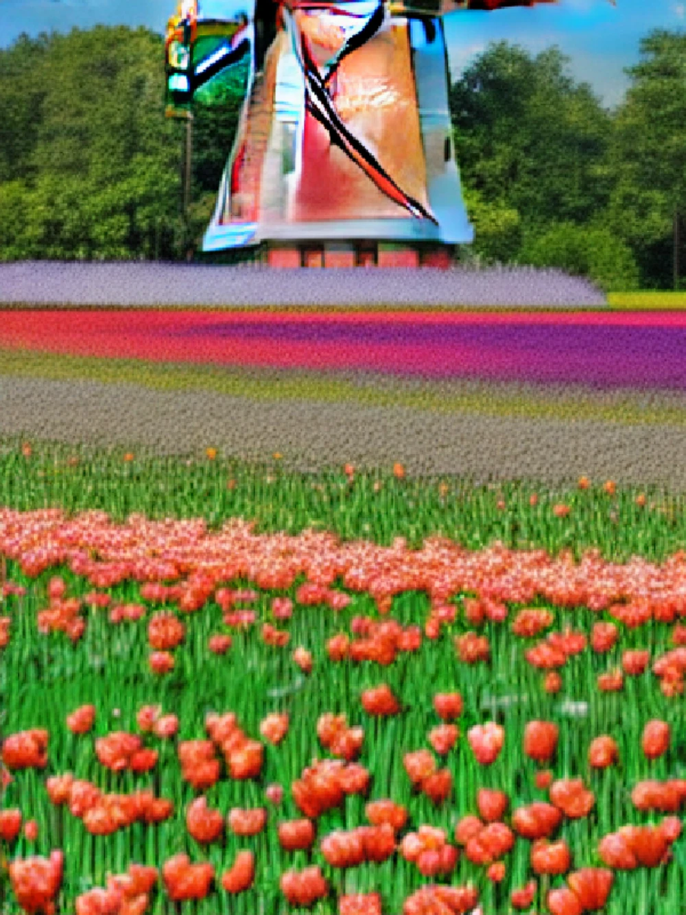 A traditional windmill in a field of tulips, A dense rainforest with a variety of wildlife