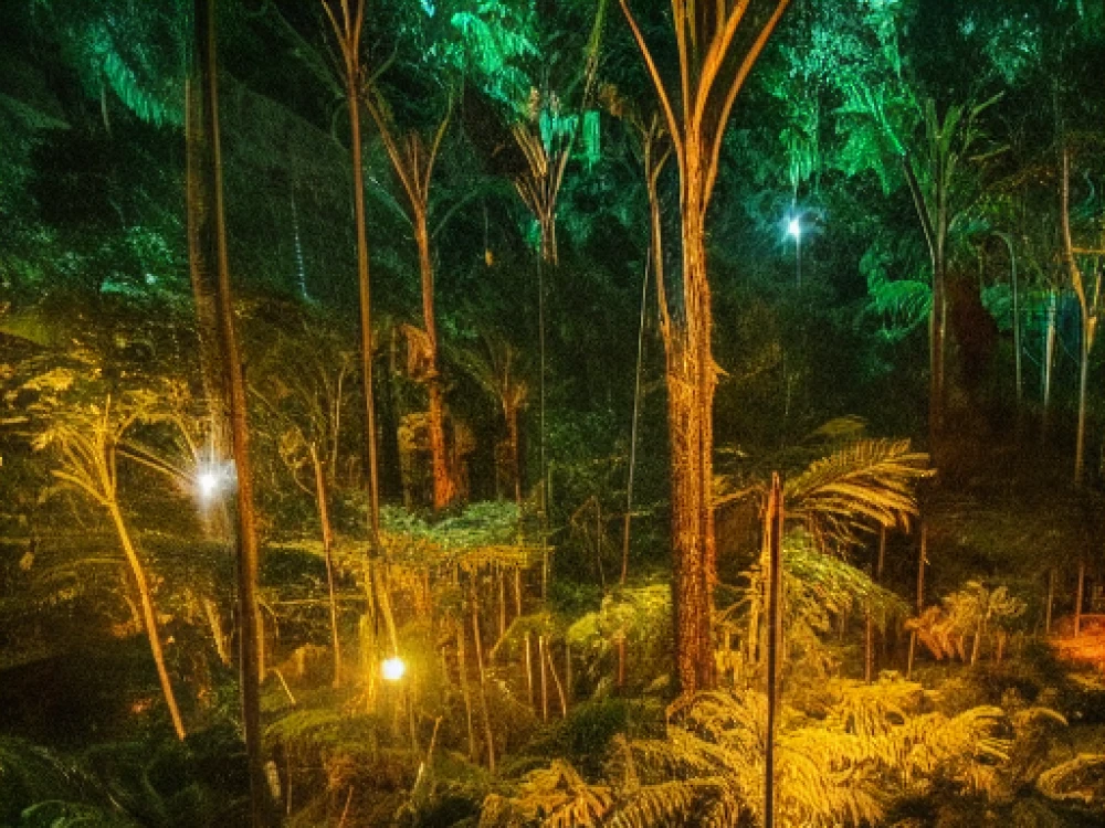A dense rainforest with a variety of wildlife, A bustling cityscape at night