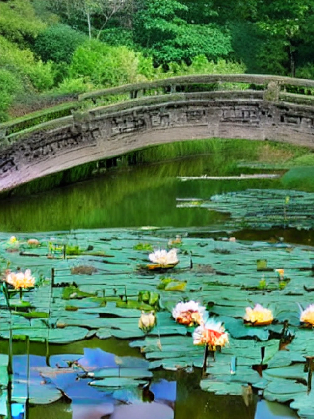 A pond filled with waterlilies and lotus flowers, An old stone bridge over a peaceful river