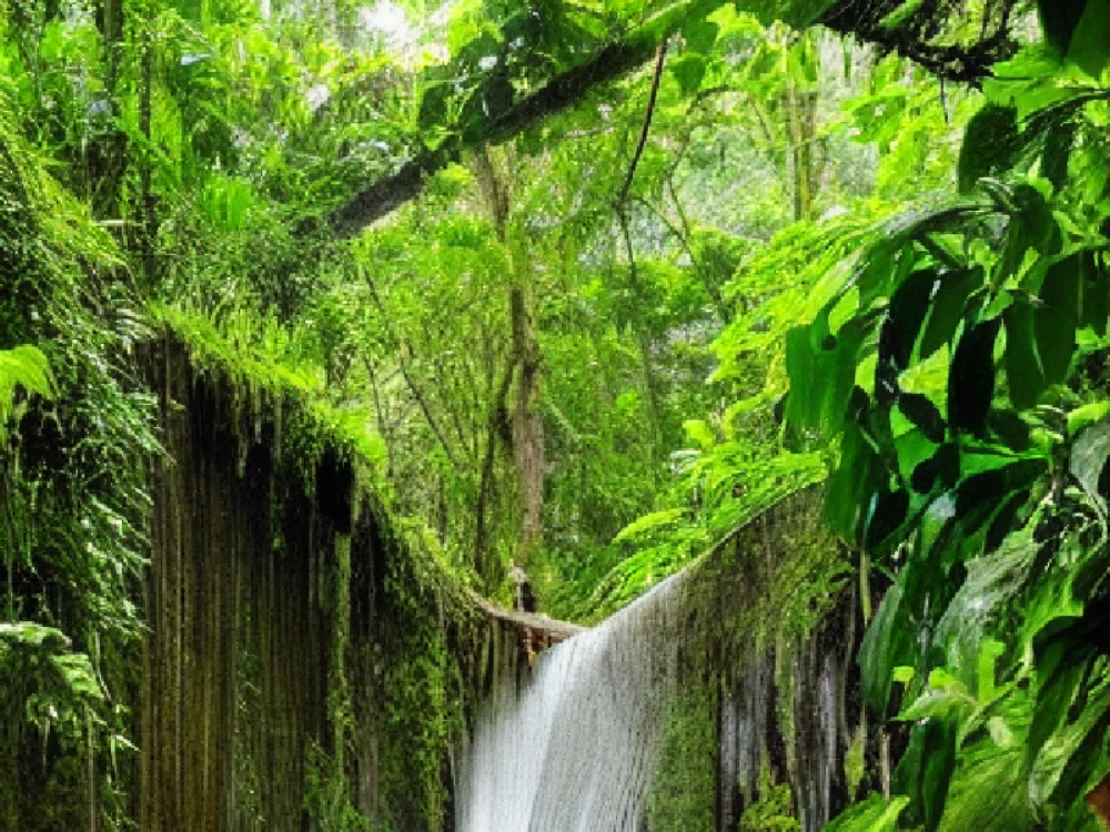 A majestic waterfall in a tropical rainforest, A vine climbing up a rustic wooden trellis