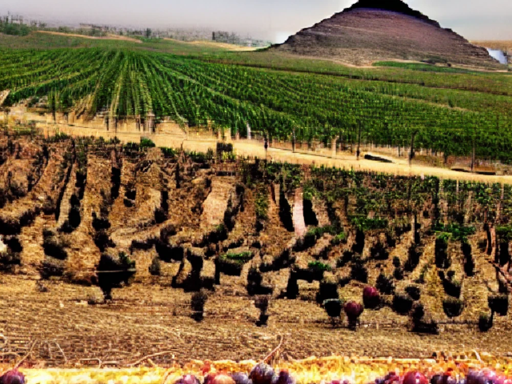 A vineyard with ripe grapes ready for harvest, The ancient pyramids of Egypt under the hot sun