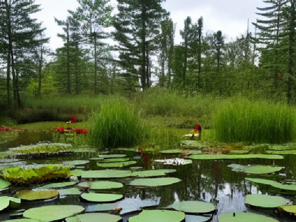 A pond filled with waterlilies and lotus flowers, A cozy cabin in a snowy forest