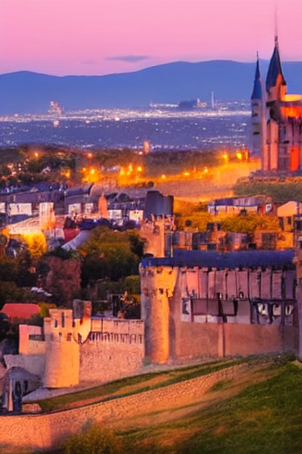 A medieval castle on a hill, A panoramic view of a modern city skyline at dusk