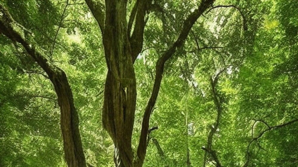 Amidst the emerald canopy of ancient trees, a whimsical hideaway perches atop sturdy branches, its wooden slats weathered to a silvery sheen. Dappled sunlight filtering through leafy boughs dances across the forest floor,