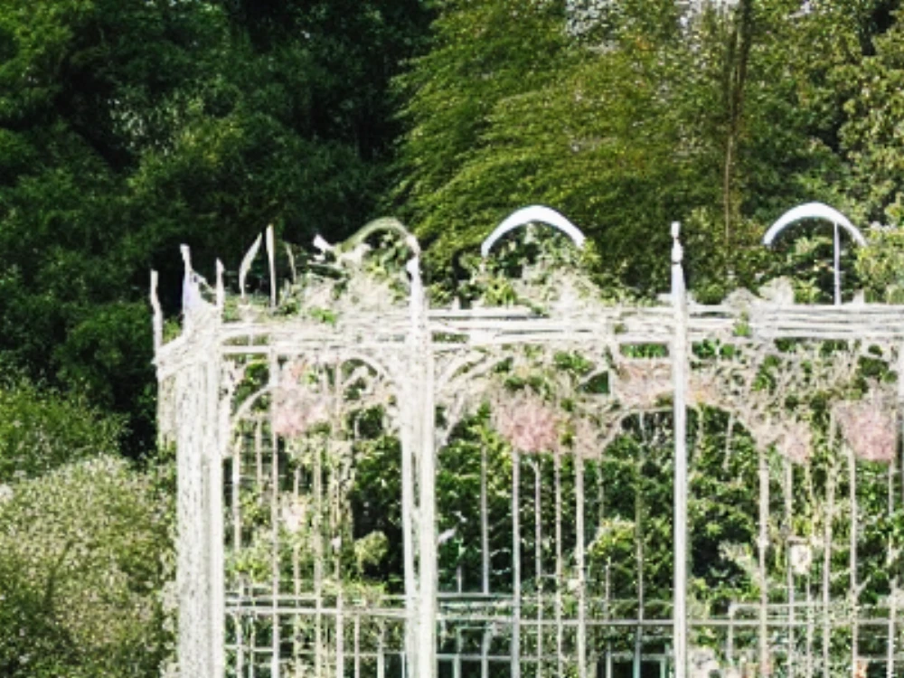 Amidst a tapestry of velvety roses, a delicate gazebo stands like a lace-covered jewel, its white latticework shimmering softly in the sunlight. The air is alive with the sweet, heady scent of blooming flowers, as petals d