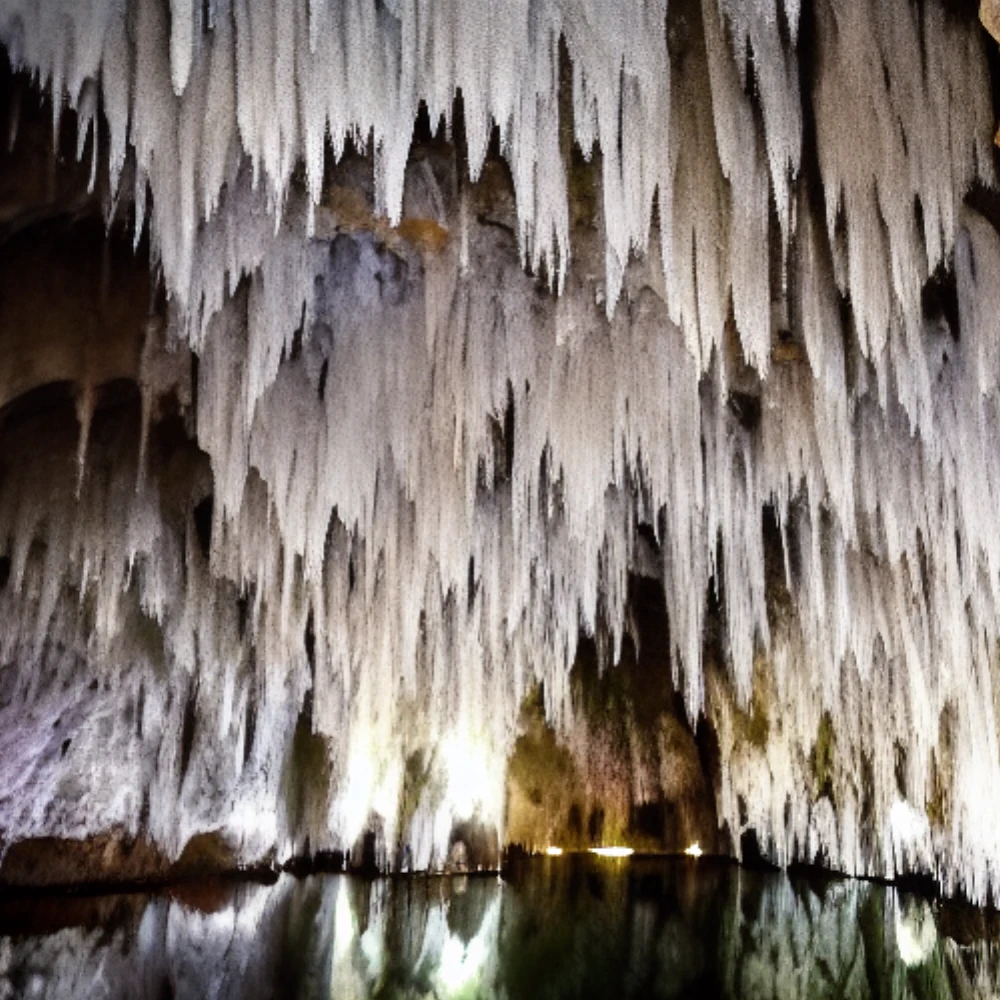 A deep cave with stalactites and stalagmites, A grand fountain in a city square