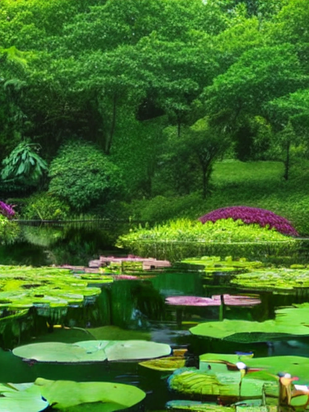 A stunning rainbow after a summer rain, A pond with lily pads and blooming lotus flowers