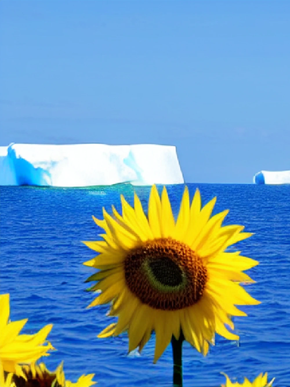 A massive iceberg in the middle of the ocean, A field of sunflowers facing the sun