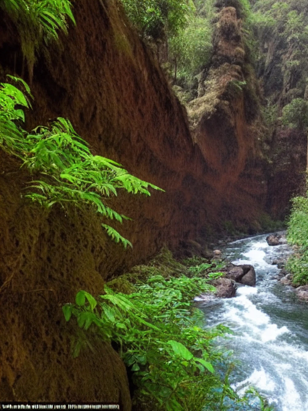 A deep canyon carved by a swift river, A dense rainforest with a variety of wildlife