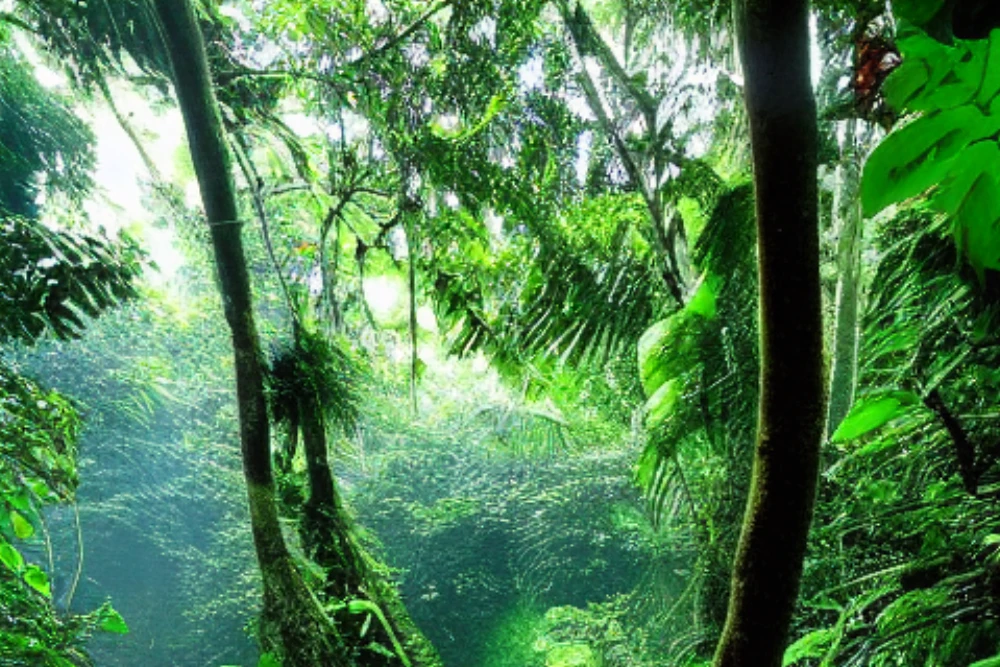 In the heart of a lush tropical forest, a secretive cascade awaited discovery, its gentle melody harmonizing with chirping birds and rustling leaves. Dappled sunlight danced through the canopy above, illuminating the misty