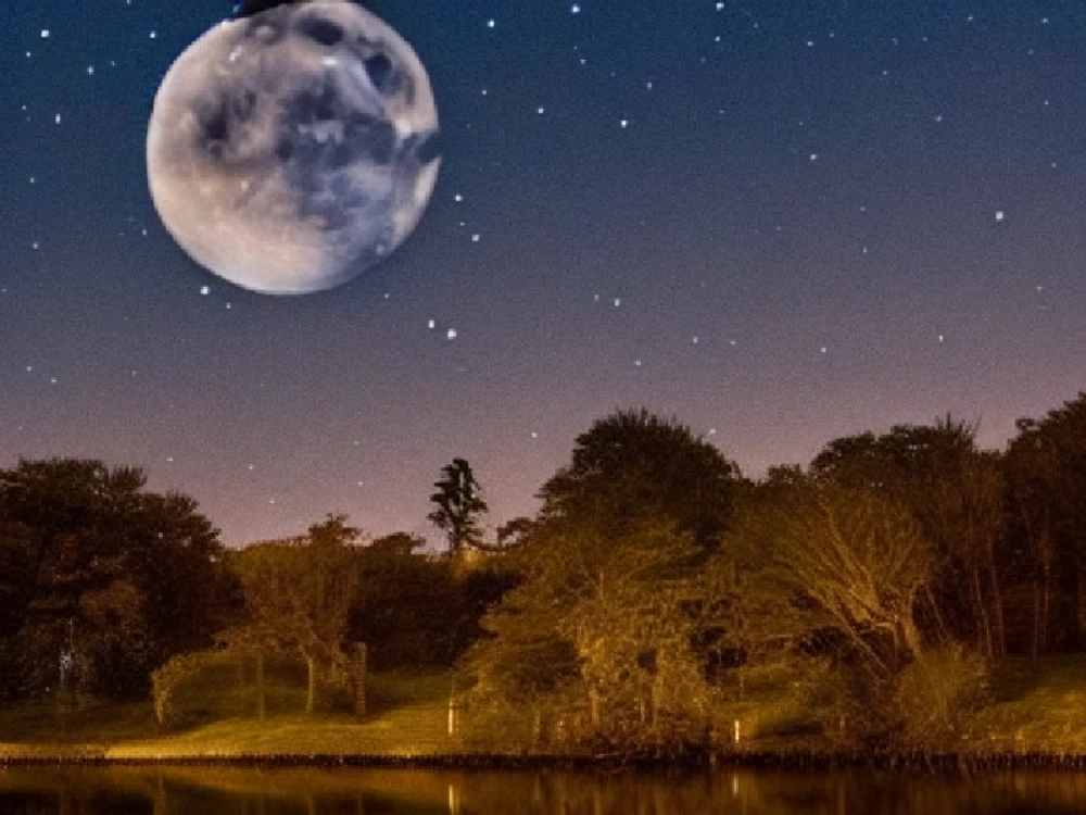 Under the silvery moon's gentle glow, a tranquil lake slumbers, its dark waters softly lapping against the shore, creating a soothing melody that echoes through the night air, punctuated by an occasional cricket's serenade