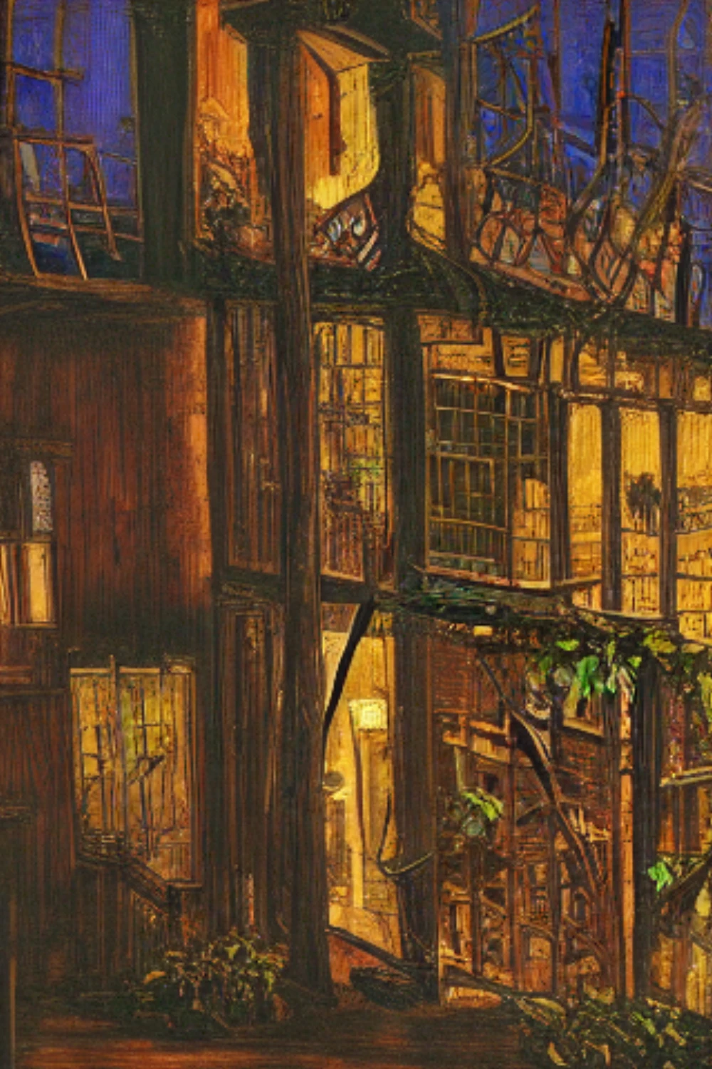 A bustling cityscape at night, A vine climbing up a rustic wooden trellis