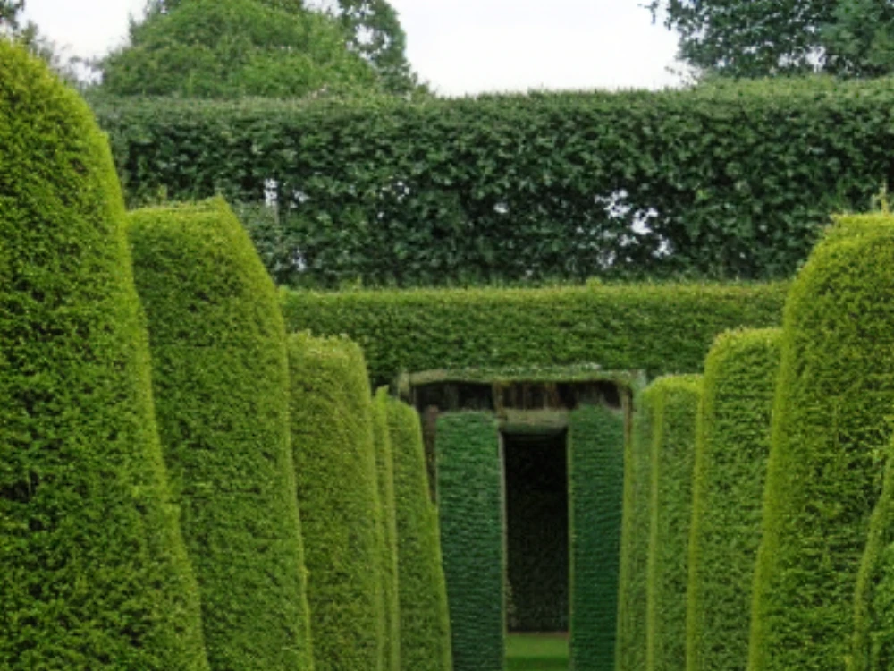 A large hedge maze in a stately home's garden, A vine climbing up a rustic wooden trellis