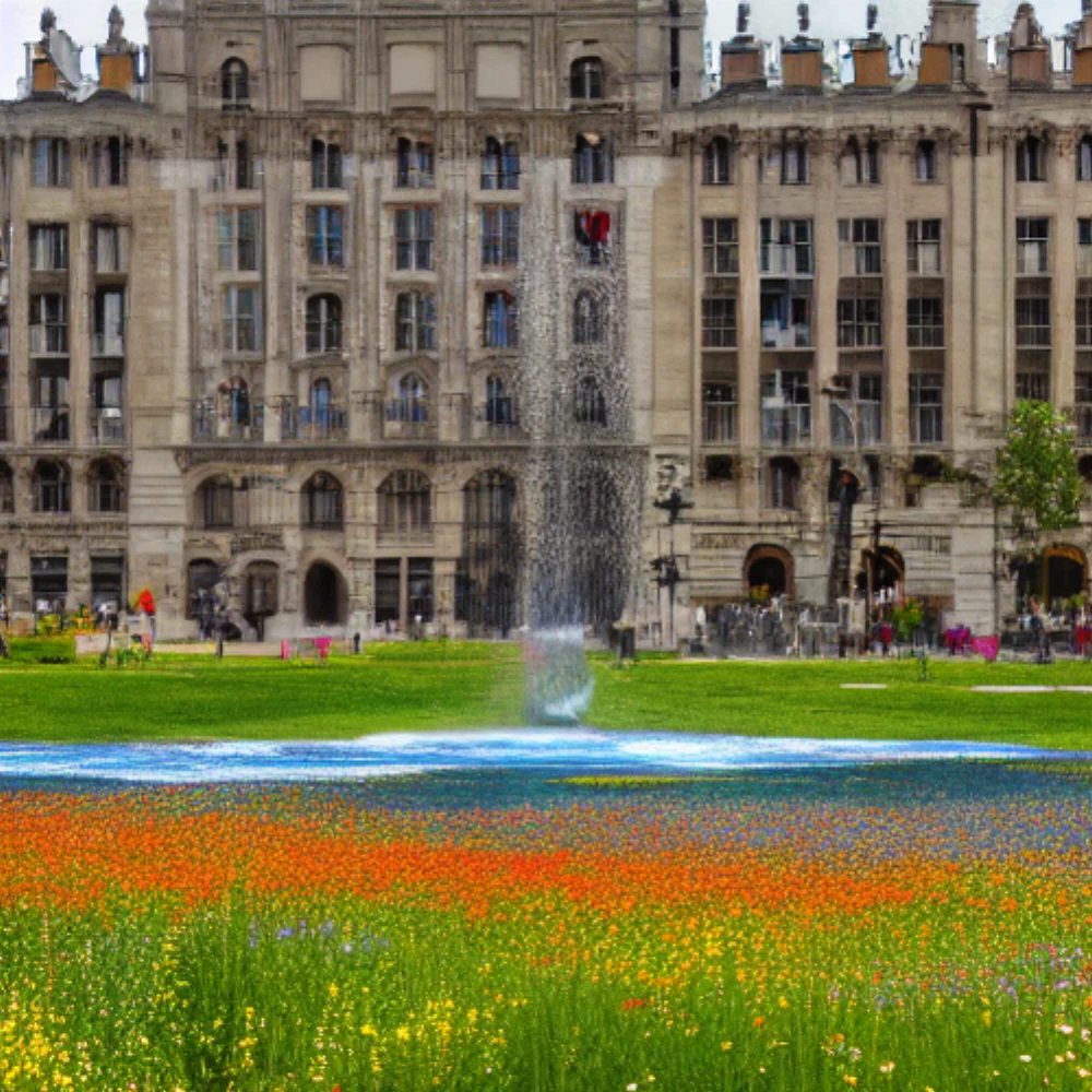 A meadow full of wildflowers in spring, A grand fountain in a city square