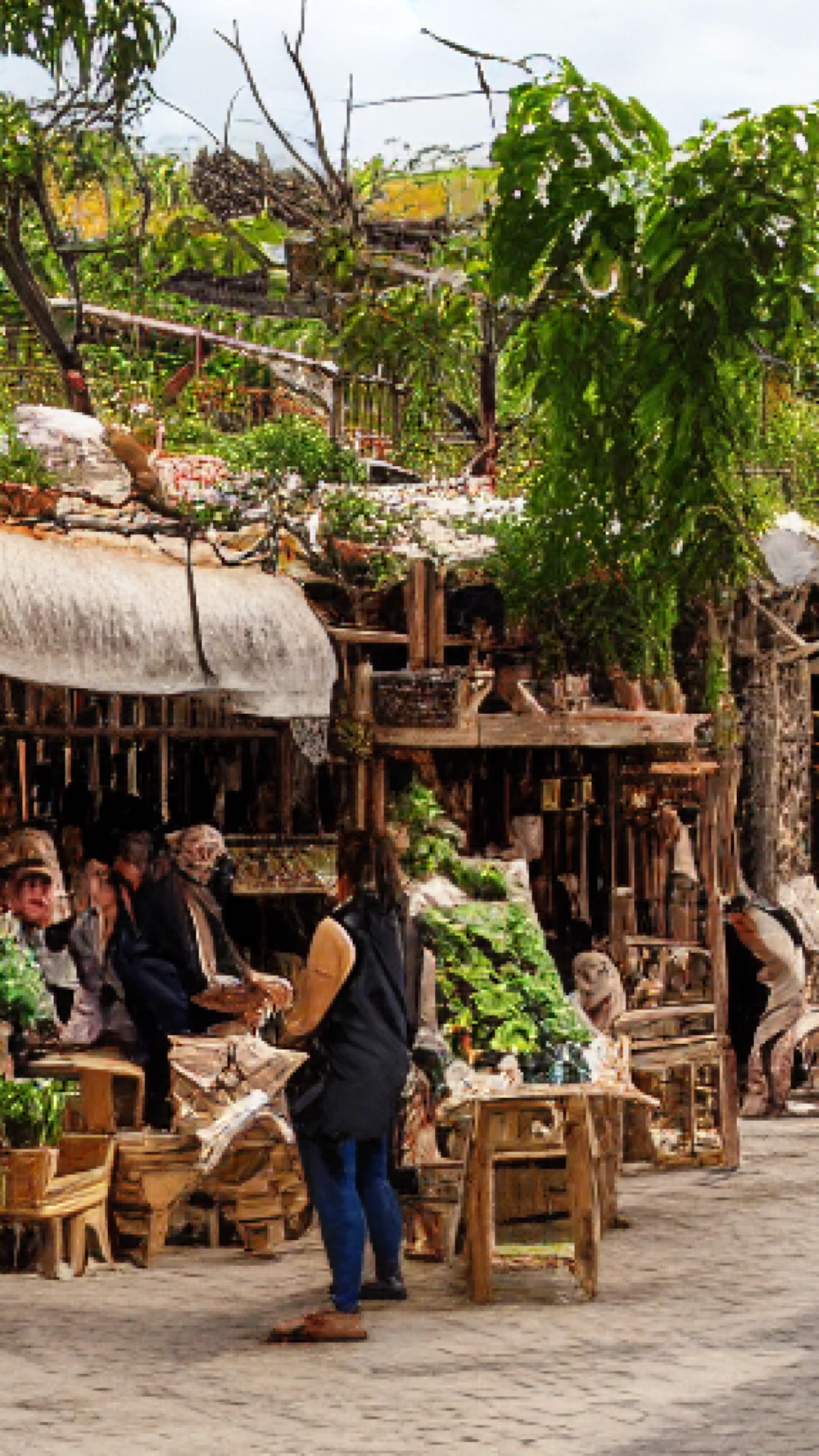 A bustling marketplace in an ancient city, A vine climbing up a rustic wooden trellis