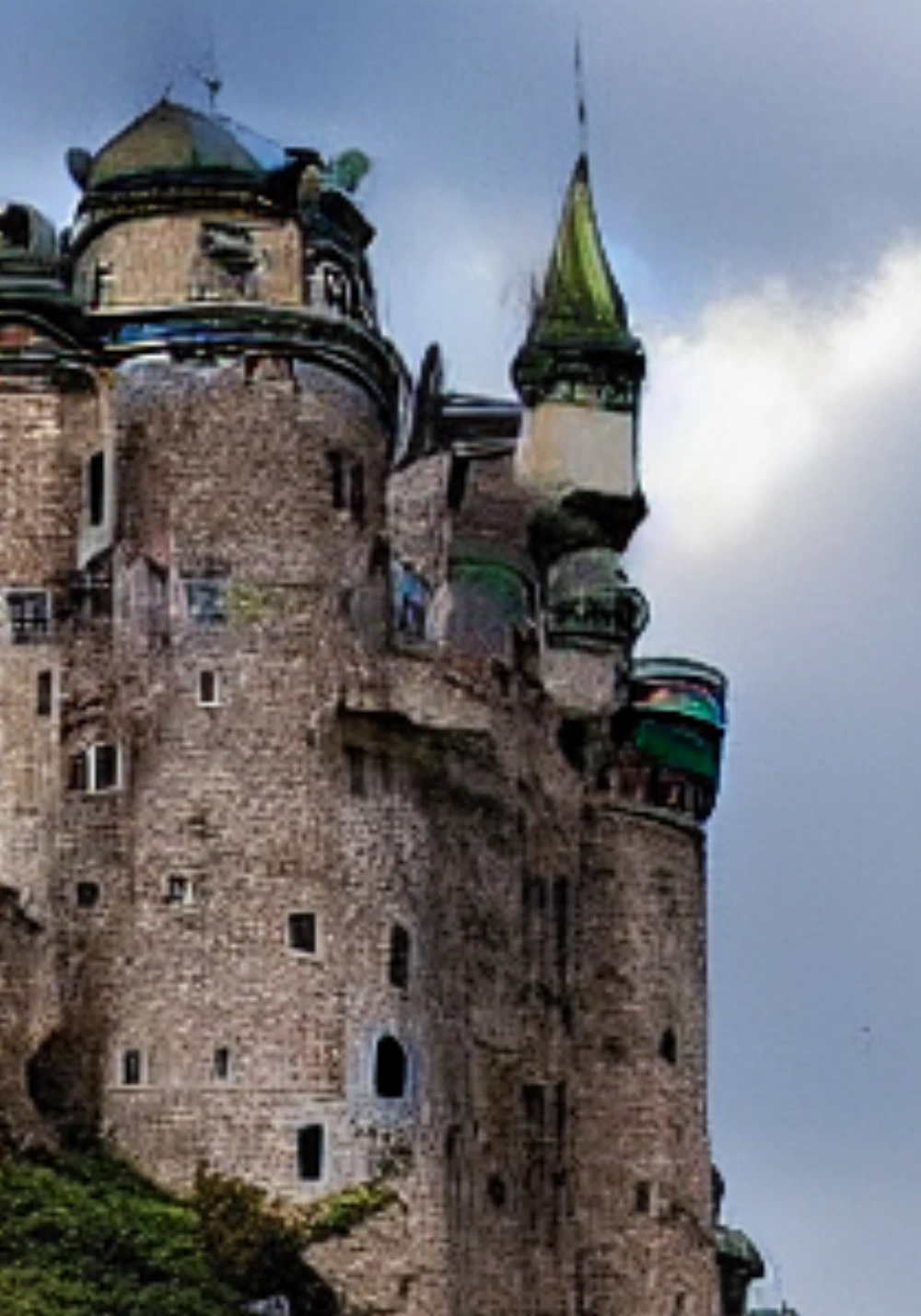 A majestic medieval fortress crowns the emerald hill, its turrets and towers piercing the sky like giant's fangs, while ancient stones, weathered to a mossy grey, whisper secrets of centuries past, their battlements graspi