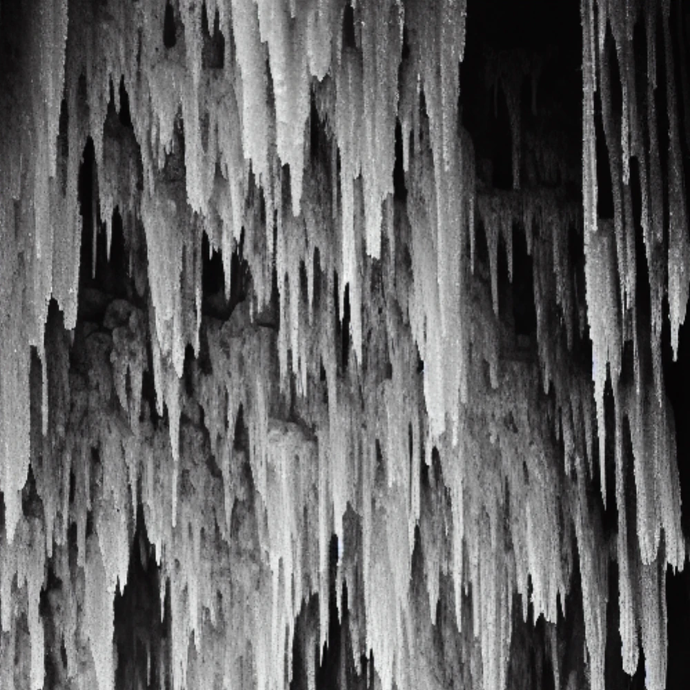 Inky darkness shrouds the vast cavern, where towering stalactites suspend like crystal swords, their tips glistening with ancient tears. The air is heavy with secrecy as stalagmites rise like sentinels, their rugged, limestone bodies worn smooth by time's