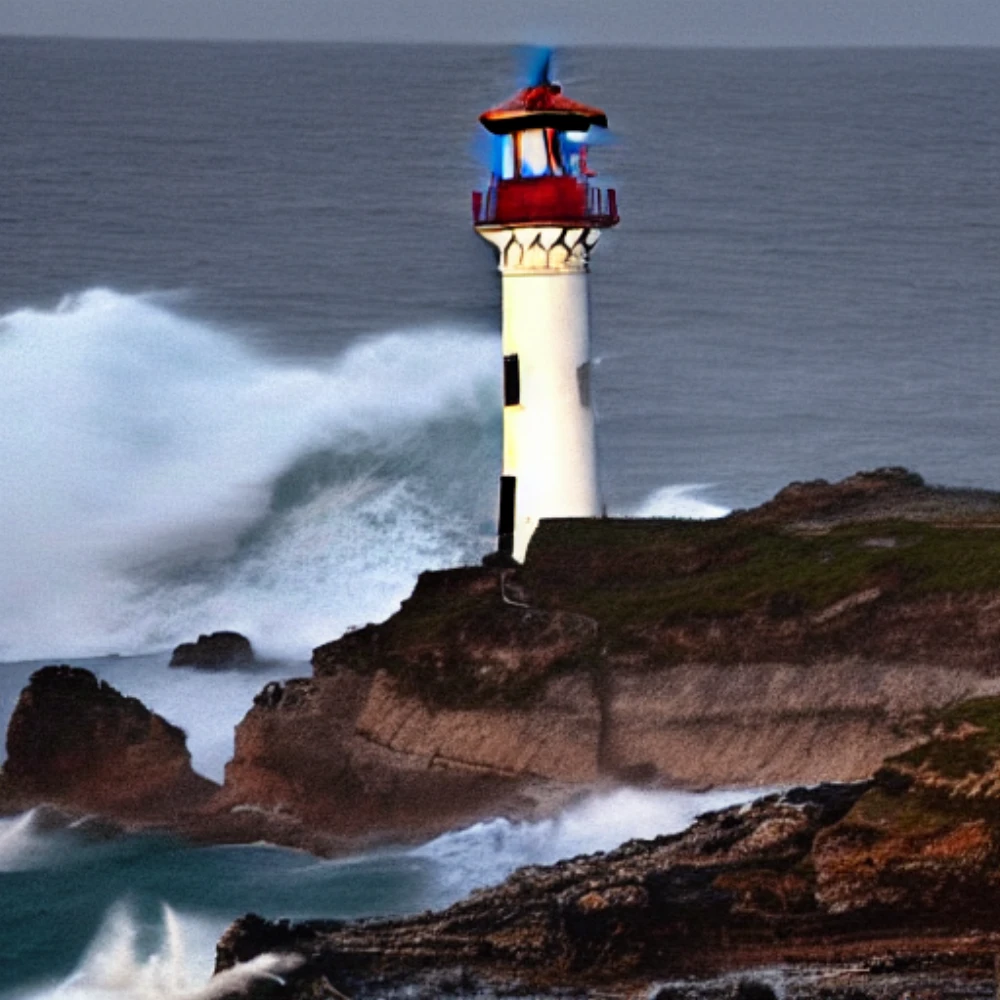 A venerable lighthouse stands sentinel on a rugged cliff, its beacon slicing through the tempestuous gloom as the stormy sea churns and foams below, waves crashing against the rocky shoreline with a fury that echoes throug