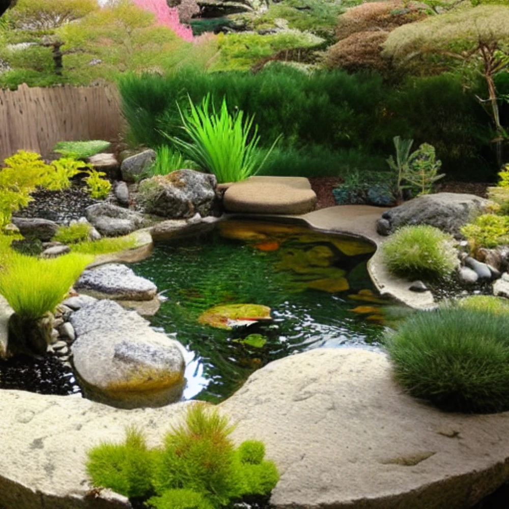 A tranquil zen garden with a koi pond, A snowy mountain range under a clear blue sky