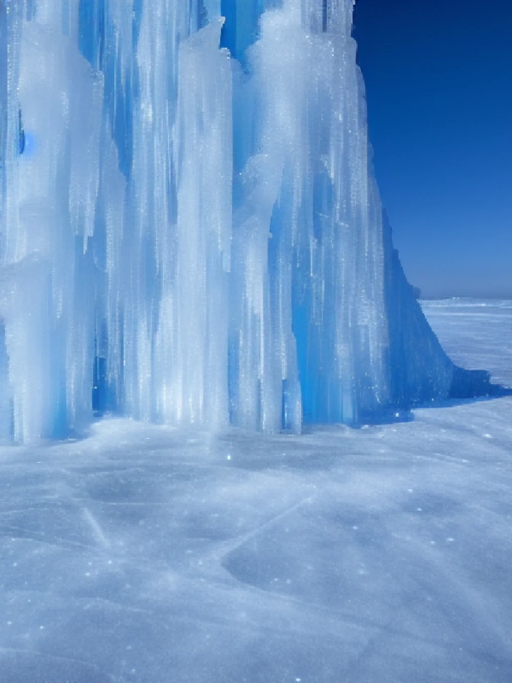 A towering behemoth of crystalline ice, its frozen bulk glimmering like a thousand diamonds, rises majestically from the dark blue expanse, its rugged, weathered edges softened only by the gentle lapping of waves against its ancient, snowy facade.