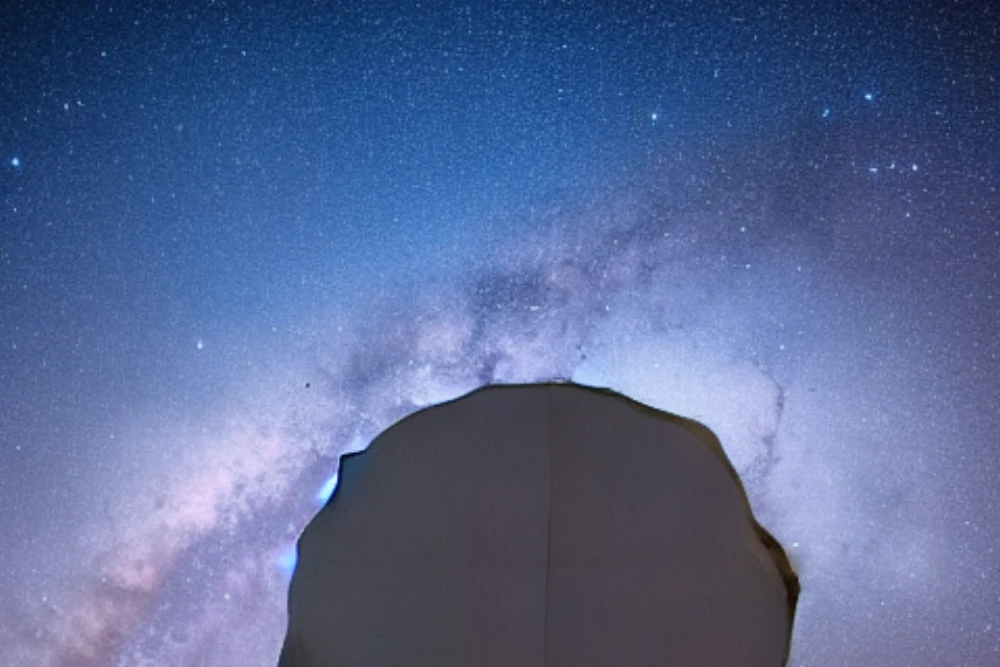A slender telescope stands sentinel, its barrel a dark silhouette against the celestial canvas, as if connecting earthbound dreams to starry whispers, its lens a window to infinity, drinking in the majesty of twinkling wor