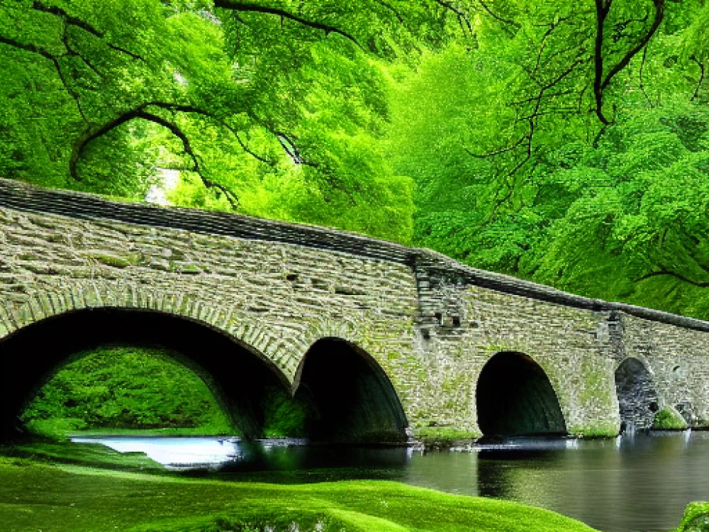 A venerable stone bridge, its moss-draped arches whispering secrets to the centuries, spans a serene river, whose glassy waters reflect the sky's cerulean hue, and whose gentle lapping against the ancient stonework echoes