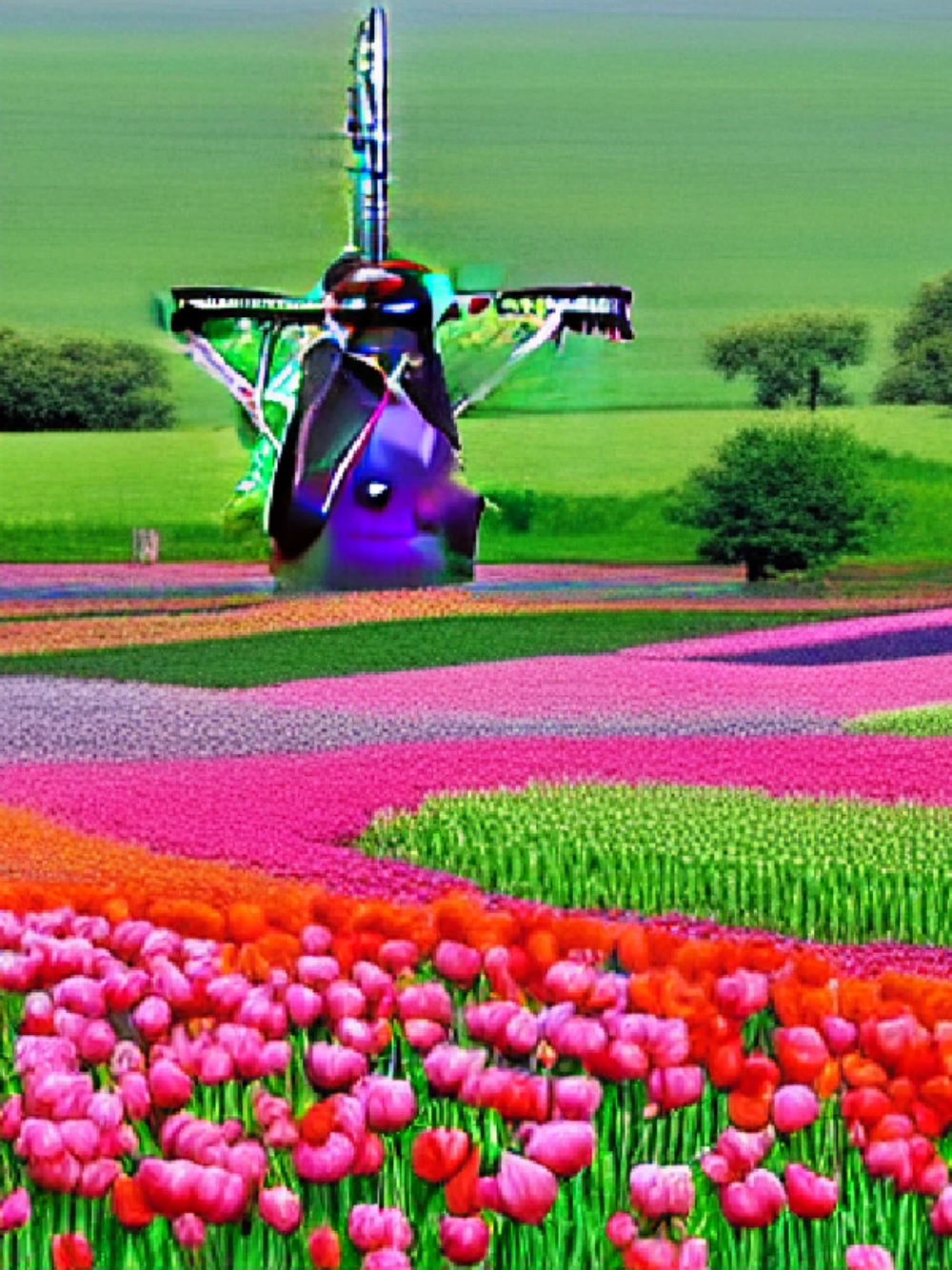 A traditional windmill in a field of tulips, A vast savannah with herds of wild animals