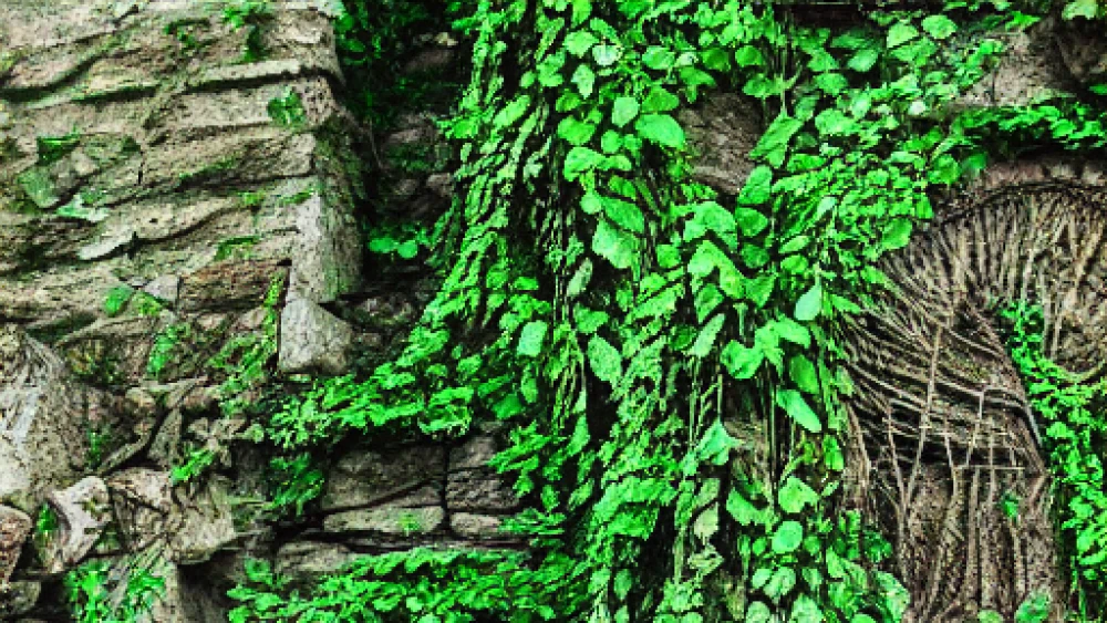 Vines ensnare crumbling stone, as emerald-green foliage consumes the once-majestic structures, softening their rugged edges. Delicate petals unfurl amidst toppled columns, and whispering leaves rustle secrets to the wind. In this eerie harmony, nature's g