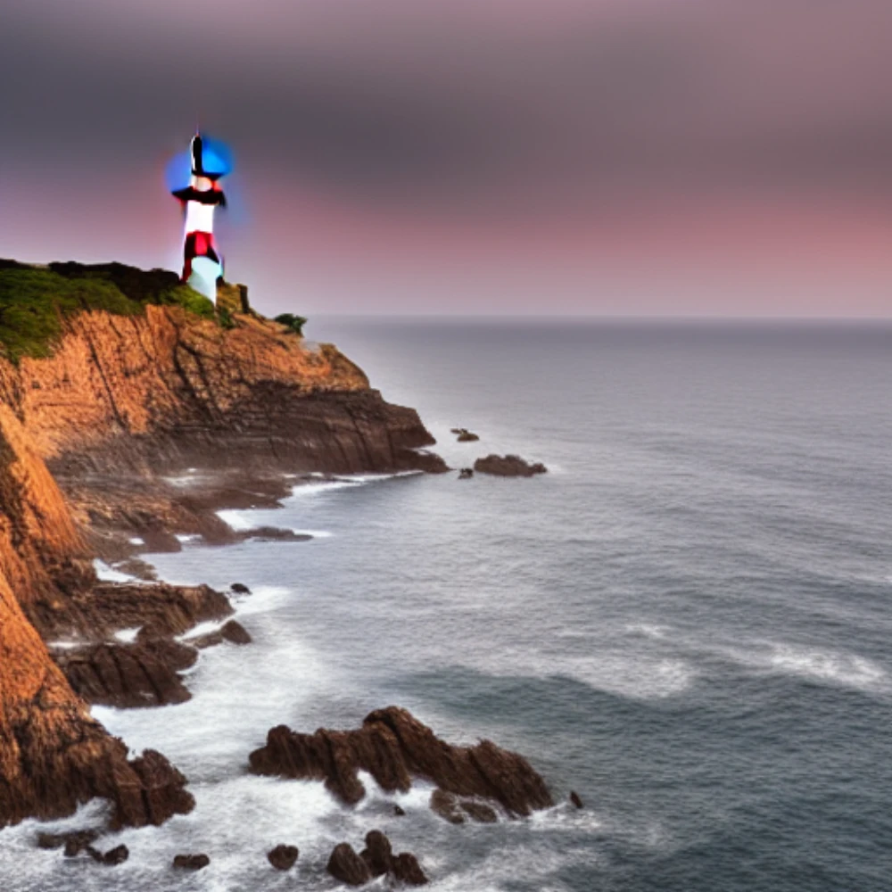 A majestic lighthouse stood sentinel on a rugged cliff, its beacon slicing through the turbulent darkness as waves crashed against the rocky shores below, their relentless fury echoing up to the lantern's steadfast heart,