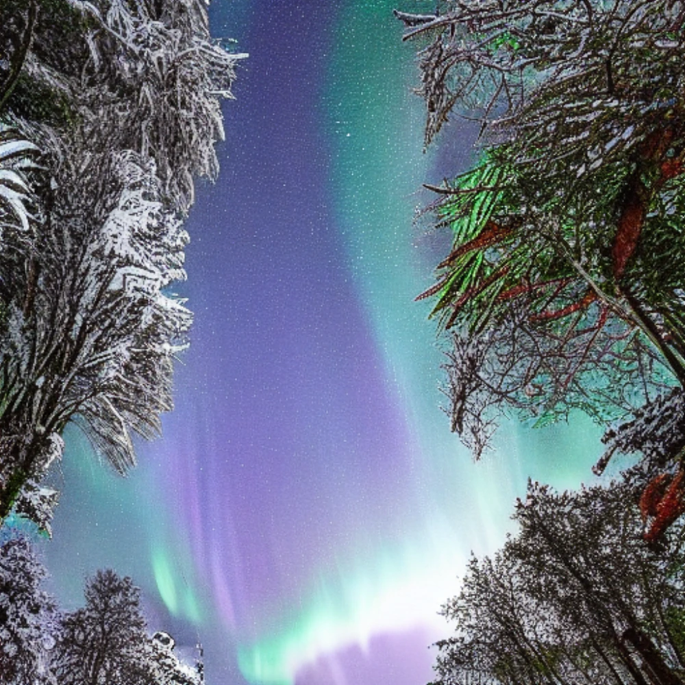 A lush jungle with exotic plants and animals, The aurora borealis over a snowy landscape