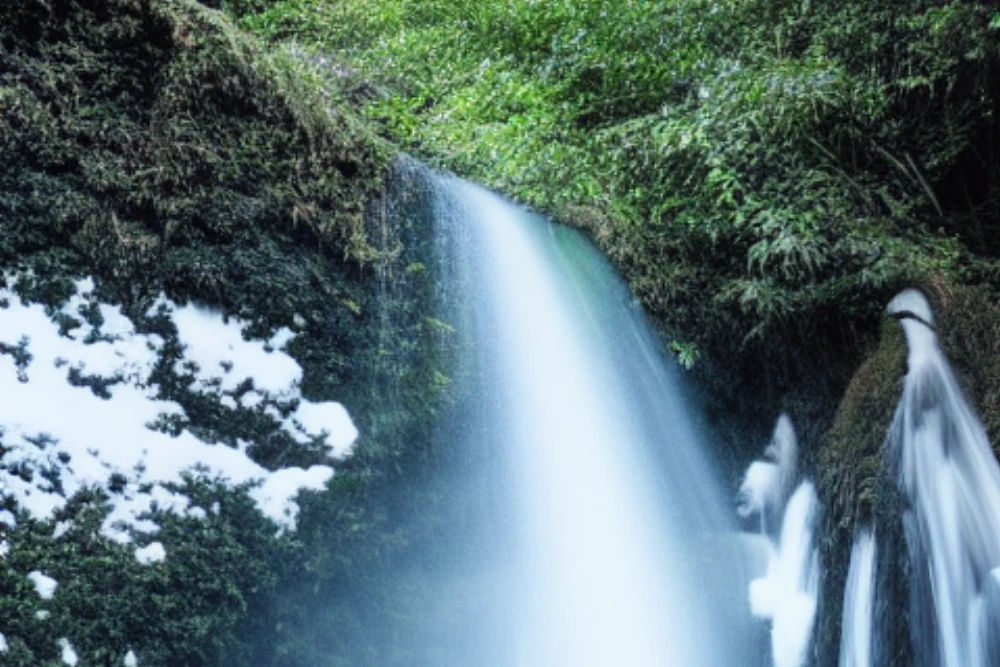 A hidden waterfall in a tropical forest, A snowy mountain range under a clear blue sky