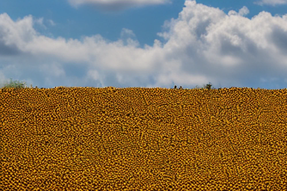 A packed stadium during a football match, A field of sunflowers facing the sun