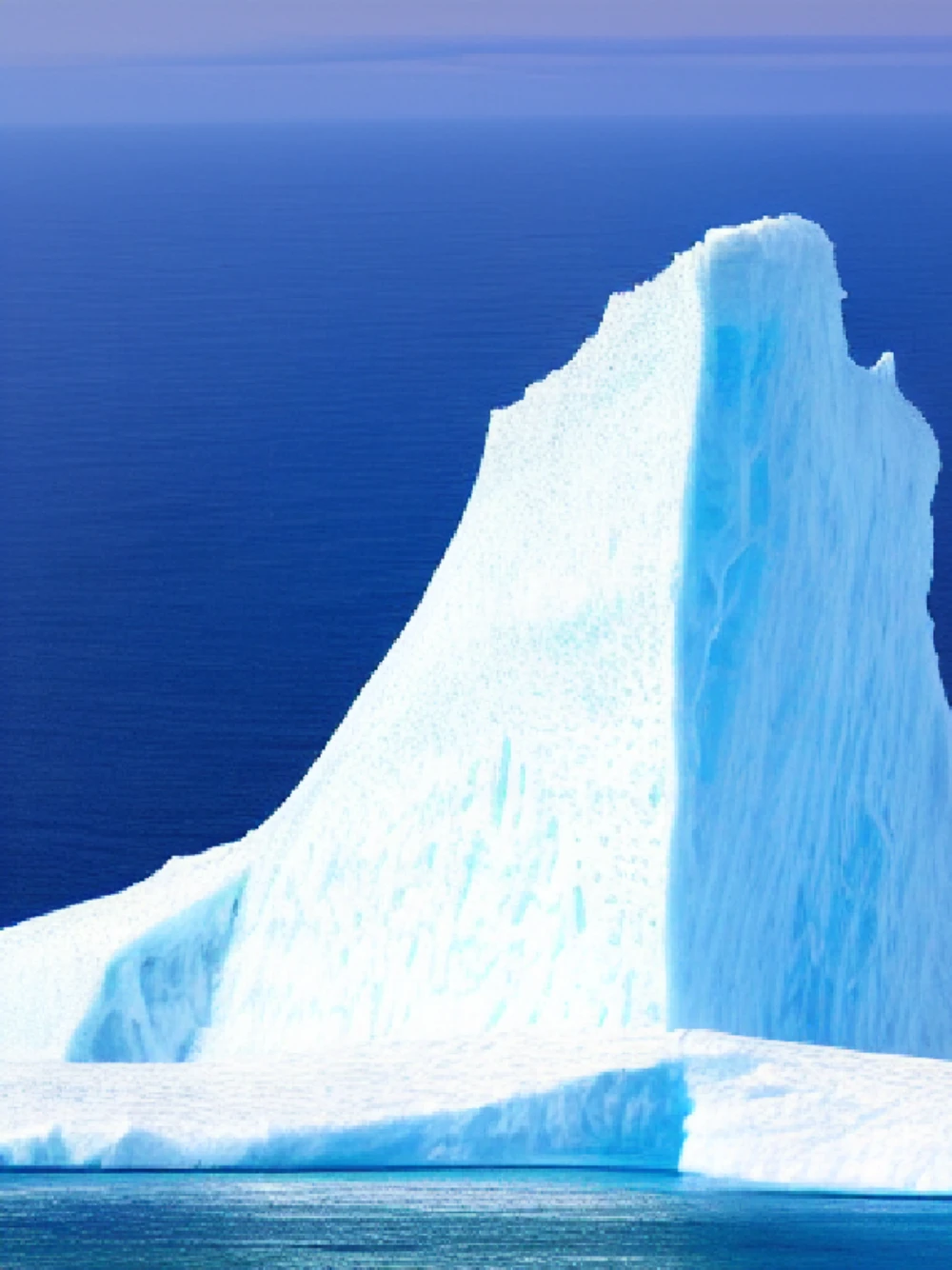 Amidst the endless blue horizon, a majestic behemoth rises from the waves: a colossal iceberg, its crystalline facades glistening in the sunlight like a scattering of diamonds on velvet cloth, its frosty slopes shimmering