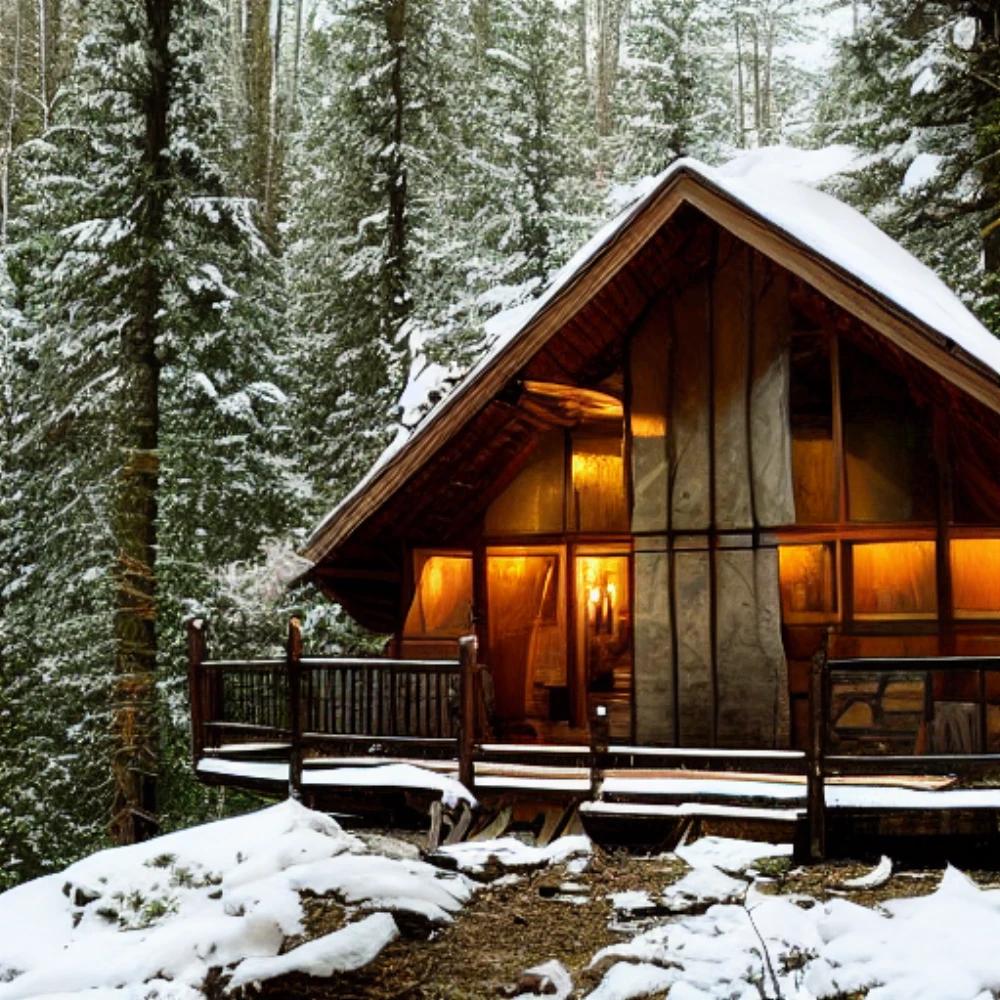 A cozy cabin in a snowy forest, A lush jungle with exotic plants and animals