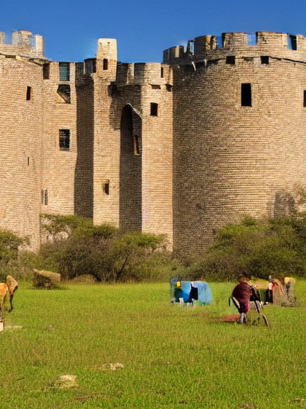 A vast savannah with herds of wild animals, A medieval castle on a hill