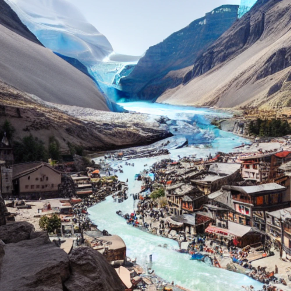A glacier slowly moving through a valley, A bustling marketplace in an ancient city
