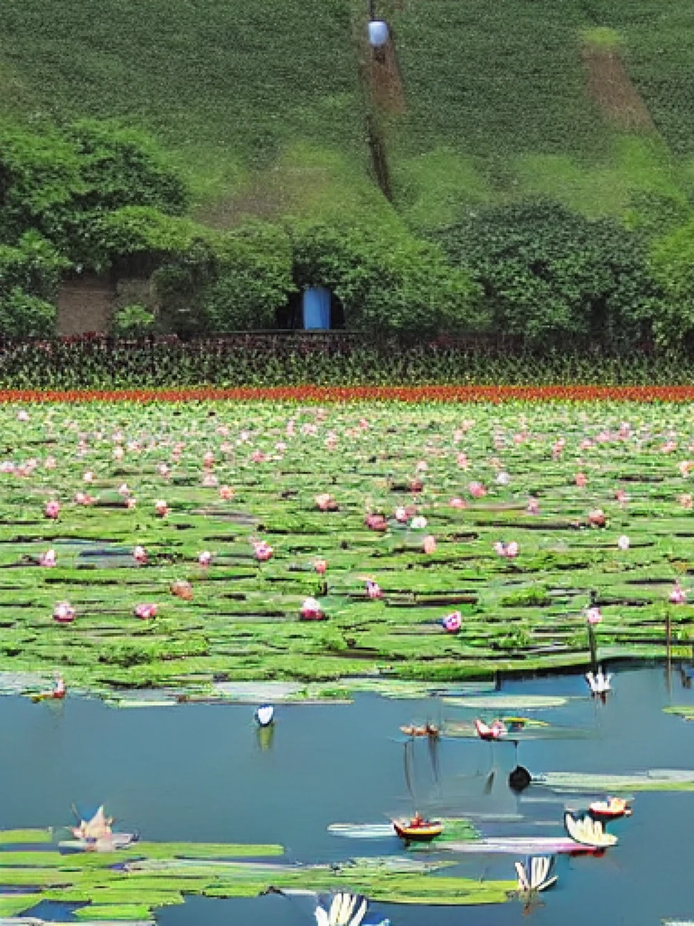 A pond filled with waterlilies and lotus flowers, A packed stadium during a football match