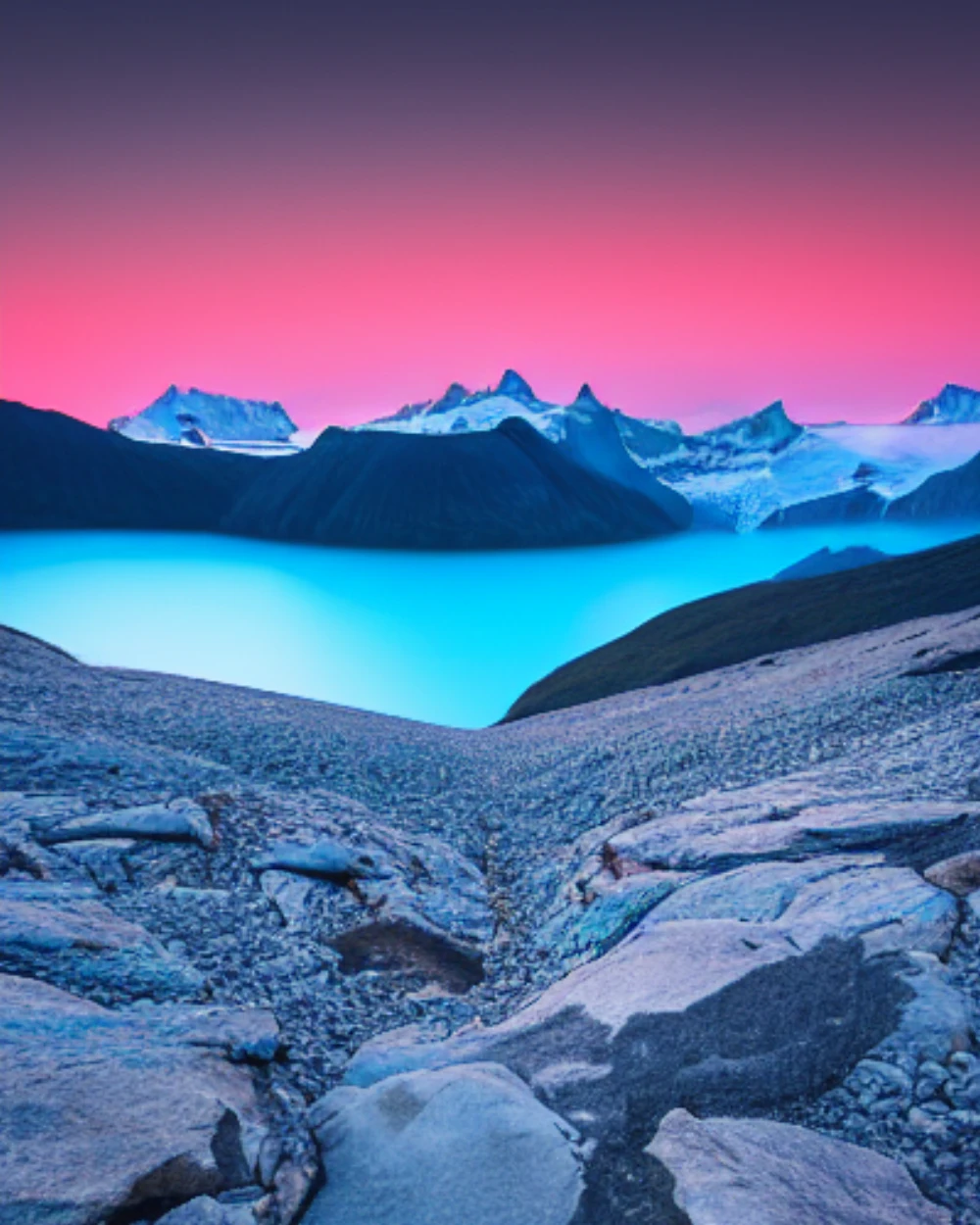 A serene sunset over a calm ocean, A glacier slowly moving through a valley