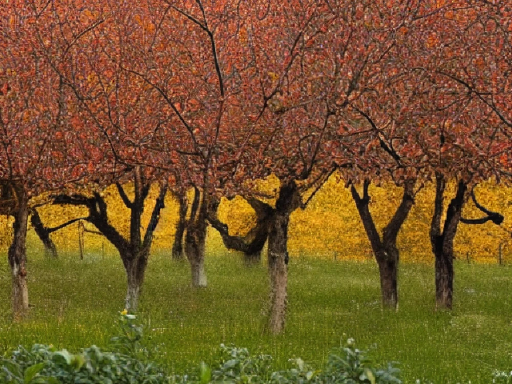 An apple orchard in the fall, A deep cave with stalactites and stalagmites