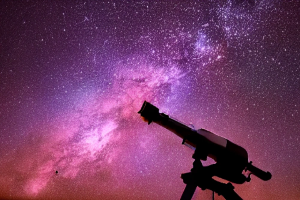A slender silhouette of a telescope pierces the darkness, its lens a beacon of curiosity, trained on the celestial canvas above, where stars twinkle like diamonds scattered across the velvet expanse, and the soft whisper o